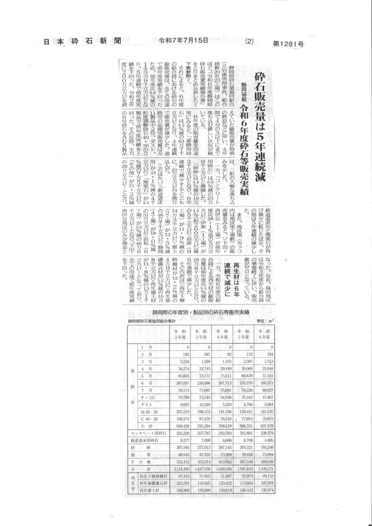 静岡県の令和6年度砕石等販売実績については、2つの業界紙(アグリゲイト、日本砕石新聞)に掲載されました。